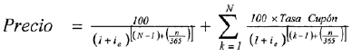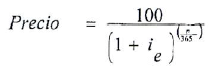Precio: Es el valor presente de un título con valor nominal de 100 unidades descontado a una tasa de interés ie.